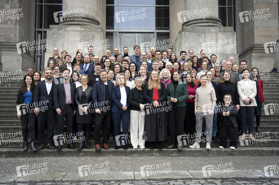 Gruppenfoto der neuen Bündnis 90/Die Grünen Fraktion nach der Fraktionssitzung der Bündnis 90/Die Grünen-Bundestagsfraktion auf der Treppe zum Reichstagsgebäude. Berlin, 26.02.2025