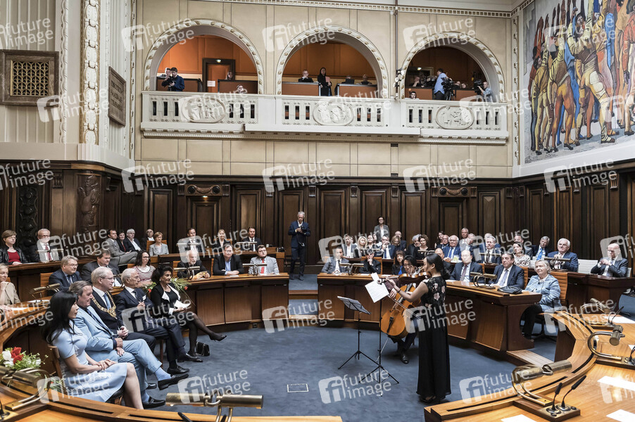 Schröder-Kim So-yeon, Gerard Schröder, Stefan Schostok, Madrid Samii, Mashid Samii und Gäste beim Empfang zum 75. Geburtstag von Ehrenbürger und Bundeskanzler a.D. Gerhard Schröder im Neuen Rathaus. Hannover, 24.04.2019