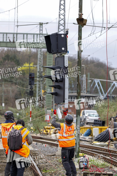 Installation Signalbrücke beim Fototermin 'Endspurt für das Elektronische Stellwerk (ESTW) Linker Rhein' am Bahnhof Köln-West. Köln, 13.03.2024