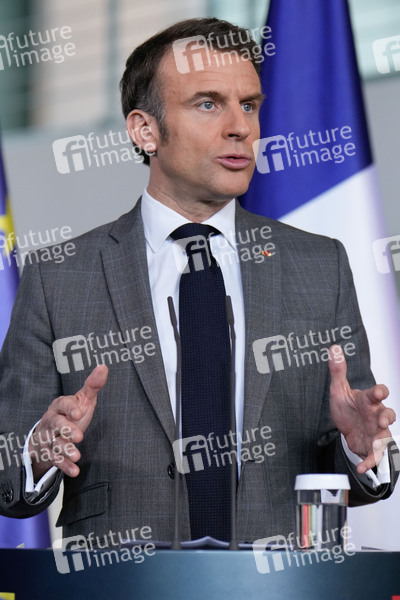 Emmanuel Macron beim Pressestatement nach einem gemeinsamen Gespräch des Weimarer Dreiecks im Bundeskanzleramt. Berlin, 15.03.2024