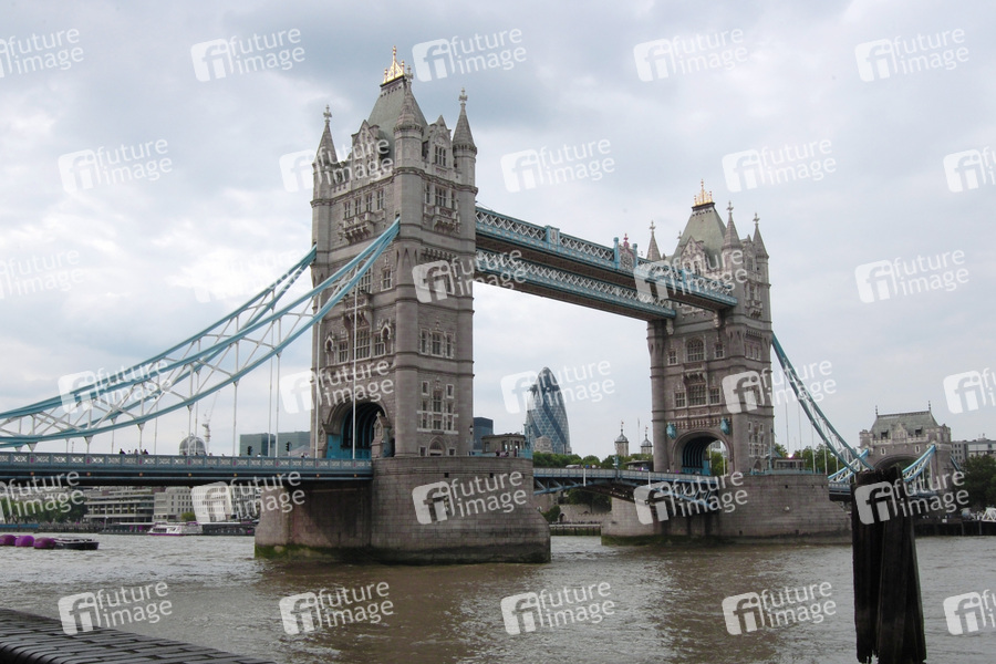 Klappbrücke, Neugotik, 244 Meter lang, Höhe der Brückentürme 65 Meter, die Fahrbahn zwischen den 61 Meter voneinander entfernten Türmen liegt neun Meter über dem Fluss, Fußgängerbrücke in 43 Meter Höhe, die beiden Baskülen können bis zu einem Winkel von 83 Grad hochgeklappt werden, Architekt Horace Jones, erbaut 1886 bis 1894, Themse, Gherkin