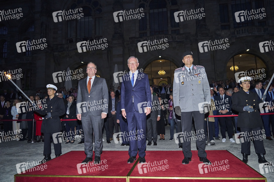 Boris Pistorius,Stephan Weil und Oberst Dirk Waldau bei der Serenade zu Ehren von Ministerpräsident Stephan Weil zu dessen Rückzug aus der Politik vor dem Gartensaal vom Neuen Rathaus. Hannover, 19.05.2025