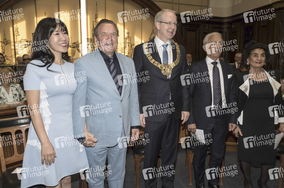 Schröder-Kim So-yeon, Gerard Schröder, Stefan Schostok, Madrid Samii und Mashid Samii beim Empfang zum 75. Geburtstag von Ehrenbürger und Bundeskanzler a.D. Gerhard Schröder im Neuen Rathaus. Hannover, 24.04.2019