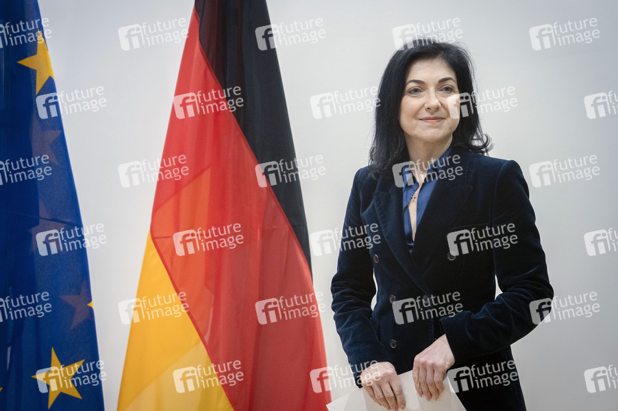 Katherina Reiche beim gemeinsamen Pressestatement der Bundesministerin für Wirtschaft und Energie und der Exekutiv-Vizepräsidentin der EU Kommission im Bundesministerium für Wirtschaft und Energie. Berlin, 19.05.2025