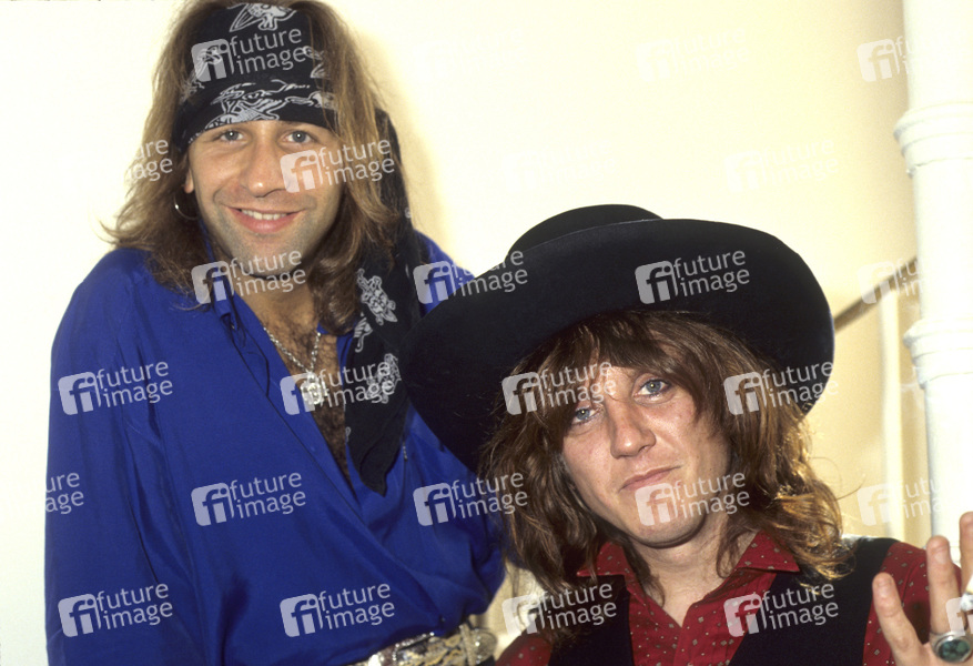 Rudi Richman und Guy Bailey von The Quireboys bei einem Photoshooting in einem Hotel. London, 14.07.1990