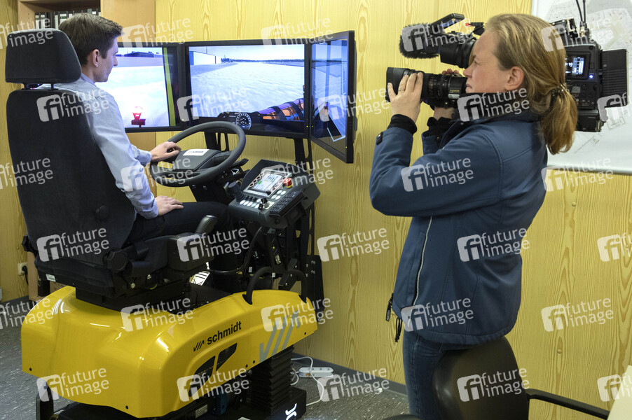 WDR-Kamerafrau, Trainer und Simulator zum Training von Schneeräumung Trainer und Simulator zum Training von Schneeräumung beim Presse-Fototermin zum Winter-Fuhrpark des Flughafens Köln Bonn Airport. Köln, 11.12.2019