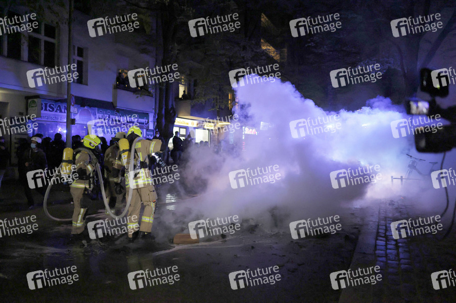 Revolutionäre 1. Mai Demonstration in Neukölln. Bei bei der linksradikalen 1.-Mai-Demo am Abend kommt es zu Ausschreitungen. Demonstranten attackieren Polizisten mit Steinen, Flaschen und Böllern, mehrere Beamte werden verletzt, es kommt zu 240 Festnahmen. Berlin, 01.05.2021