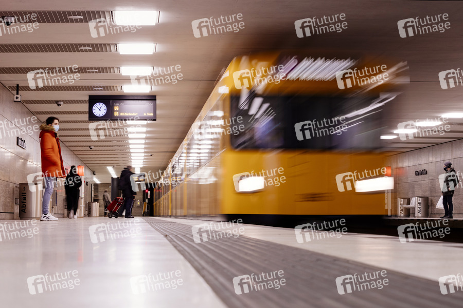Aufgrund der Coronakrise war 2020 für die BVG ein katastrophales Jahr. Die Zahl der Fahrgäste schrumpfte auf zwei Drittel, die Ertragseinbußen liegen im dreistelligen Millionenbereich. In Bahnen und am Gleis gilt Maskenpflicht. Trotzdem wollen die Berliner Verkehrsbetriebe in den kommenden Jahren extra lange Bahnen mit einer Gesamtlänge von 50 Meter anschaffen. Im Bild die der neue U-Bahnhof 'Unter den Linden'. (Themenbild, Symbolbild) Bild aufgenommen mit Genehmigung der BVG-Pressestelle Berlin, 01.01.2021