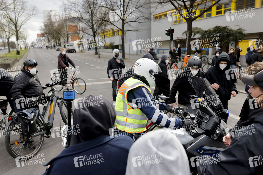 Protest, Demo, Demonstration, Corona-Maßnahmen-Kritiker, Corona-Hygieneregeln, Distanz, Mund-Nasen-Schutz, Protestierende, Demonstranten, Polizei, Polizisten, Gegner der Corona-Maßnahmen, Infektionsschutzgesetz, Corona-Notbremse, Eindämmung der dritten Pandemiewelle, Coronaleugner, Teilnehmer, Corona-Regeln, Pandemie, Corona-Demo, Coronademo, Querdenker, Querdenken, Gegendemonstranten, Corona-Leugner, Demo gegen Lockdown