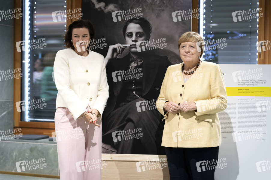 Dorothee Bär und Angela Merkel bei der Ausstellungseröffnung 'Unsichtbare Wissenschaftlerinnen - Versäumte Bilder' im Bundesministerium für Forschung, Technologie und Raumfahrt. Berlin, 16.09.2025