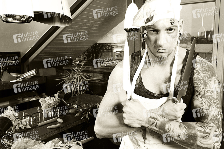 SOLsnap Cover-Model März 2012, Küche, Koch, Chef de Cuisine, Messer, Tattoo, Tätowierung