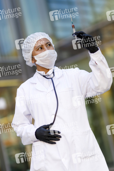 Eine Virologin posiert mit einer Spritze zur Impfung gegen das Corona-Virus. (Symbolfoto mit Model) Nürnberg, 23.04.2020