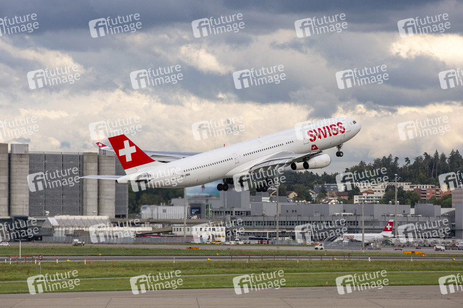 Airbus A340-313X, Reg: HB-JMA beim Abflug vom Flughafen Zürich, 15.08.2019