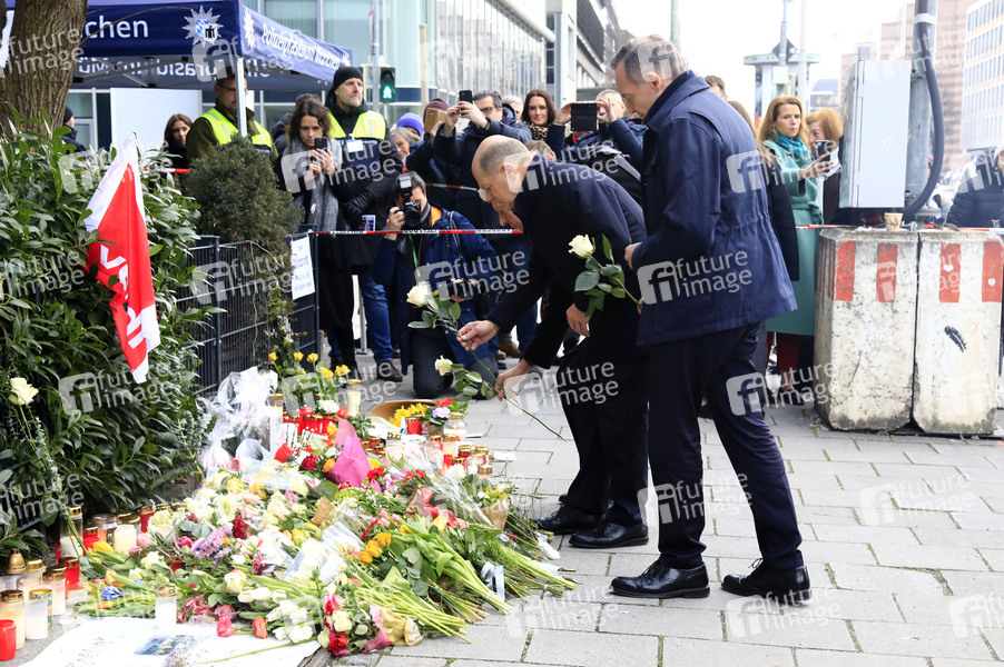 Olaf Scholz und Volker Wissing beim stillen Gedenken am Ort des mutmaßlichen Anschlags vom 13. Februar. München, 15.02.2025