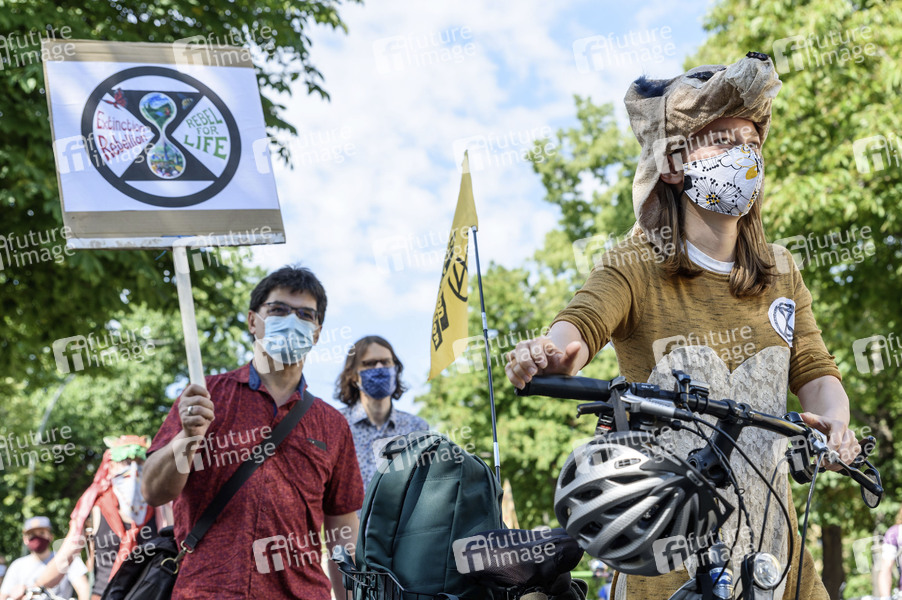 Mit zwei Demonstrationszügen vom Bundesfinanzministerium und vom Bundestag zum Bundeswirtschaftsministerium und einer anschliessenden 24-Stunden-Kundgebung starten die Klimaschützer von Extinction Rebellion (XR) die Berliner Aktionswoche gegen klimafeindliche Wirtschaftspolitik. Die Klimagerechtigkeitsbewegung will mit diversen Aktionen und zivilem Ungehorsam die Bundesregierung, Lobbyverbände und Unternehmen zu mehr Klimaschutz bewegen. Berlin, 15.06.2020