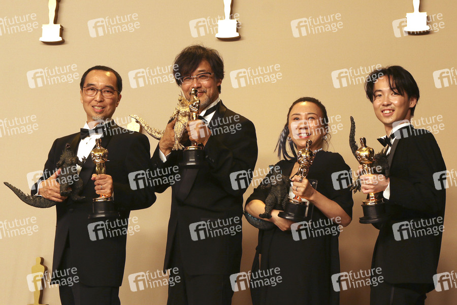 Masaki Takahashi, Takashi Yamazaki, Kiyoko Shibuya und Tatsuji Nojima mit den Oscars für die besten visuellen Effekte bei 'Godzilla Minus One' im Press Room der Oscar Verleihung 2024 / 96th Annual Academy Awards im Dolby Theatre. Los Angeles, 10.03.2024