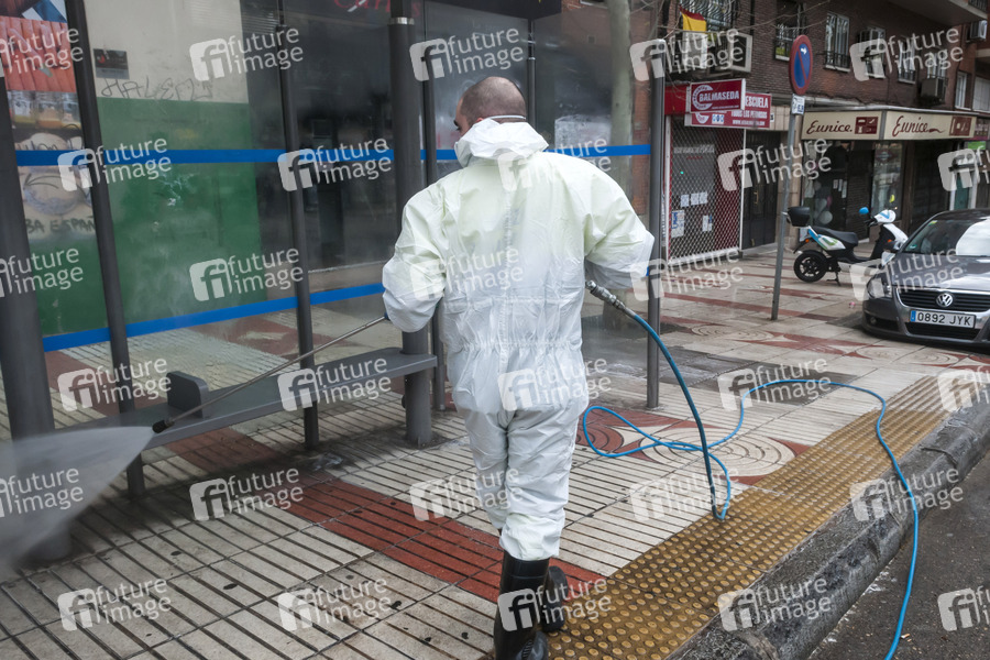 Die spanische Regierung hat den Ausnahmezustand wegen des Coronavirus COVID-19 erklärt. Die Bevölkerung steht 15 Tage zu Hause unter Quarantäne. Die spanische Polizei und Armee überprüfen Menschen, die durch die Straßen gehen. Erlaubt sind Gänge in Krankenhaus, in Supermärkte, Kioske und Apotheken, sowie das Ausführen von Haustieren und der Weg zur Arbeit. Madrid, 19.03.2020