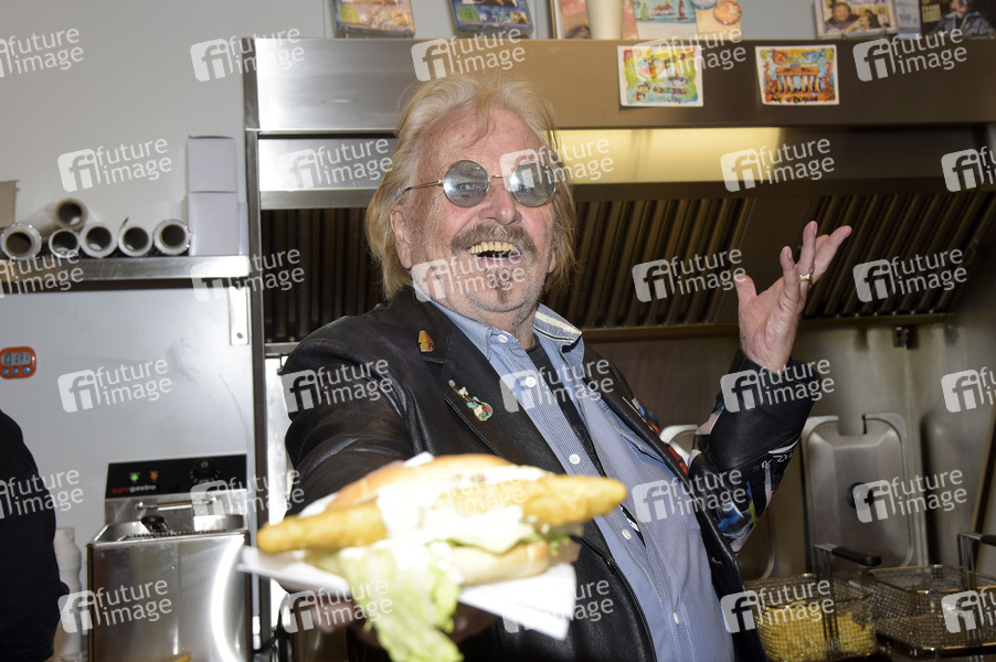 Frank Zander präsentiert sein neues Imbiss-Rezept 'Zander im Brötchen' im Würfel I. Das Backfischbrötchen à la Frank Zander gibt's demnächst exklusiv an den Würfel-Imbissen in Reinickendorf. Berlin, 14.04.2025