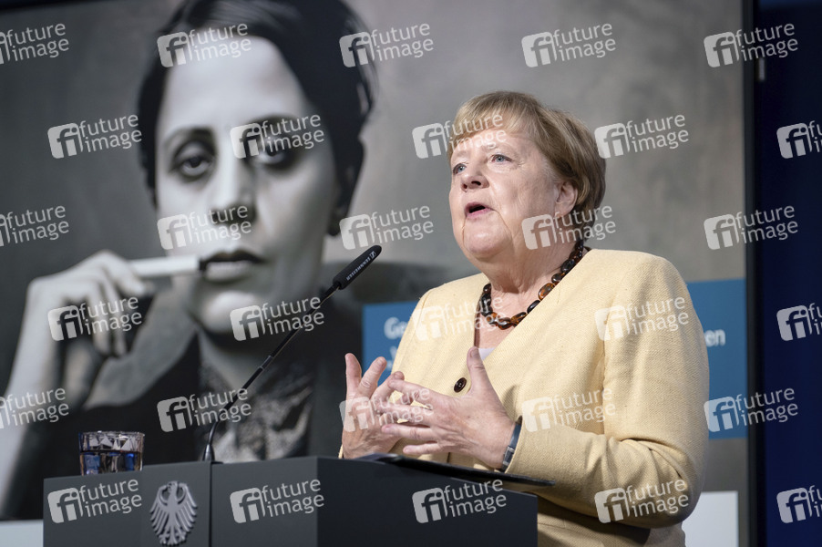 Angela Merkel bei der Ausstellungseröffnung 'Unsichtbare Wissenschaftlerinnen - Versäumte Bilder' im Bundesministerium für Forschung, Technologie und Raumfahrt. Berlin, 16.09.2025