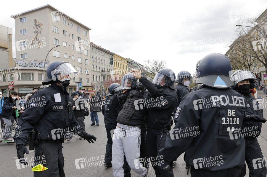 Demonstration in Kreuzberg unter dem Motto 'Generation miteinander - Herzensangelegenheit' aus dem Kreis der Querdenker-Bewegung. Am Rande der Demo kam es zu zahlreichen Gegenprotesten. Berlin, 24.04.2021