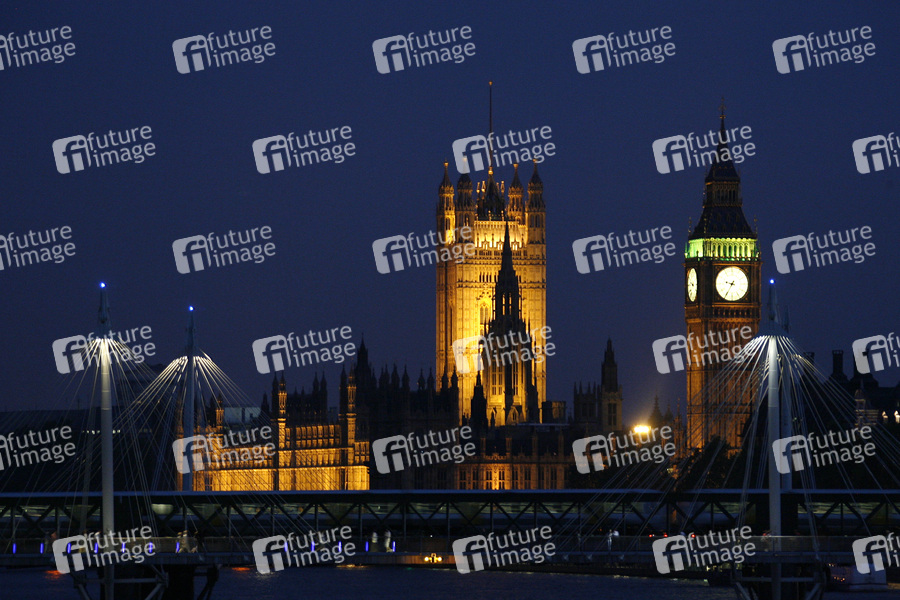 UNESCO Weltkulturerbe, Gotik Bau in dem das aus dem House of Commons und dem House of Lords bestehende britische Parlament tagt, Victoria Tower, Clock Tower Big Ben, Central Tower, Themse, Nachtaufnahme, Hungerford Bridge, Golden Jubilee Bridges