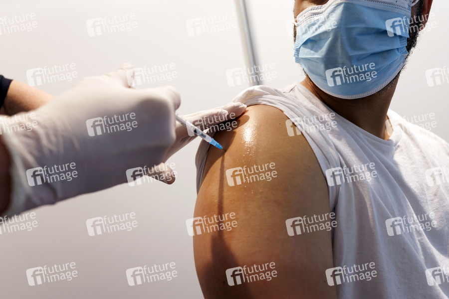 Ein Impfling erhält seine Booster-Impfung. Beim Walk-In, Drive-In und Bike-In in der Lanxess Arena sind parallel Impfungen für Erwachsene und Kinder möglich. Das rechtsrheinische Impfzentrum betreiben Lanxess Arena und Stadt Köln gemeinsam. (Themenbild, Symbolbild) Köln, 20.12.2021