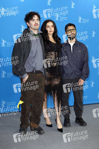Aidan Zamiri, Charli xcx und David Hinojosa beim Photocall zum Kinofilm 'The Moment' auf der Berlinale 2026 / 76. Internationale Filmfestspiele Berlin im Hotel Grand Hyatt. Berlin, 14.02.2026