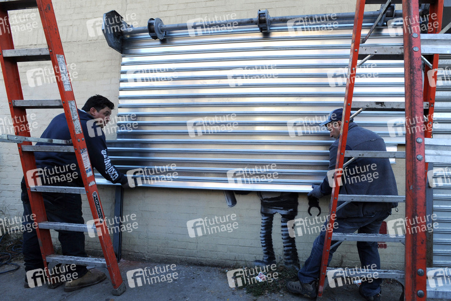 Banksy Graffiti in Coney Island als Teil seiner einmonatigen Aktion 'Better out than in'. Die Besitzer des Gebäudes brachten umgehend ein Rolltor an, um das Werk vor Vandalismus zu schützen, sie planen es später mit Plexiglas abzudecken. New York, 27.10.2013