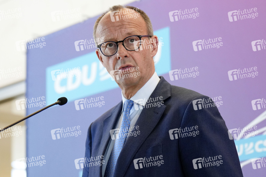 Friedrich Merz beim Pressestatement der CDU/CSU-Bundestagsfraktion zum Bundeshaushalt 2025 im Reichstagsgebäude. Berlin, 05.07.2024