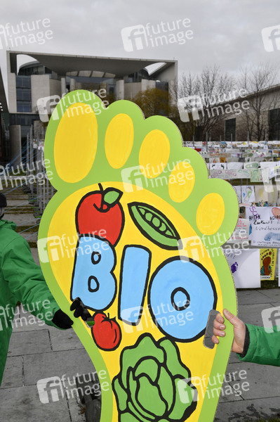 Landwirte, Klima- und Tierschützer demonstrieren unter dem Motto 'Wir haben es satt' für eine Wende in der Agrarpolitik. Vor dem Kanzleramt wird symbolisch mit rund zehntausend Fußabdrücken auf Papier eine bäuerliche, ökologische und klimafreundliche Landwirtschaft gefordert. Berlin, 16.01.2021