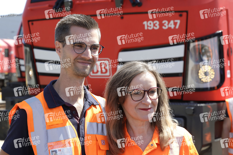 Lokführer und Sigrid Nikutta bei der Vorstellung der ersten Güterzuglokomotive,, die für den automatisierten Streckenbetrieb umgerüstet wurde im DB Cargo-Werk Köln-Gremberg. Köln, 04.07.2025