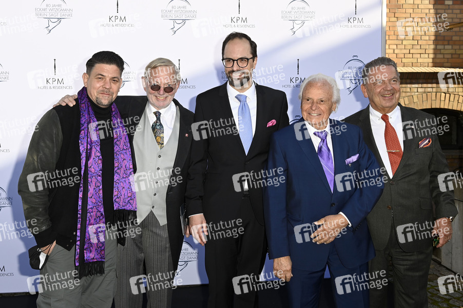 Tim Mälzer, Hans-Peter Wodarz, Tobias Berghäuser, Eckart Witzigmann und Jörg Woltmann beim Event 80 Jahre Eckhart Witzigmann im KPM Quartier. Berlin, 09.10.2021