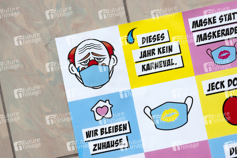Eine Plakatkampagne stimmt die Kölner darauf ein, an Karneval wegen der Corona-Pandemie zu Hause zu bleiben. An Karneval gilt ein Alkoholkonsumverbot und ein Alkoholabgabeverbot, der traditionelle Rosenmontagszug findet nur virtuell in einer Puppenversion statt. (Themenbild, Symbolbild) Köln, 05.02.2021