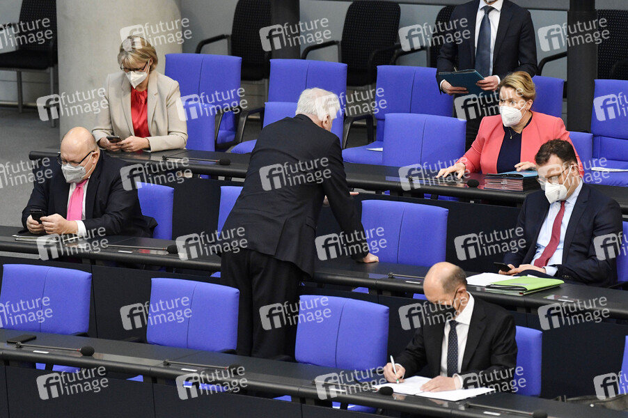 Peter Altmaier, Anja Karliczek, Horst Seehofer, Olaf Scholz, Franziska Giffey und Jens Spahn in der 223. Sitzung des Deutschen Bundestages im Reichstagsgebäude. Berlin, 21.04.2021