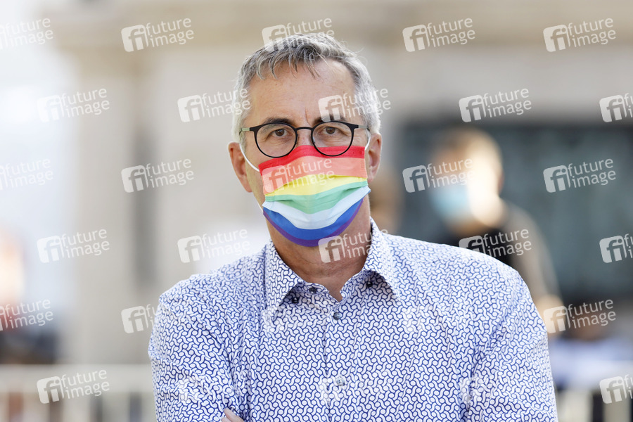 Andreas Wolter redet bei einem Wahlkampf-Auftritt für die Kölner Grünen auf dem Heumarkt. Köln, 22.09.2021