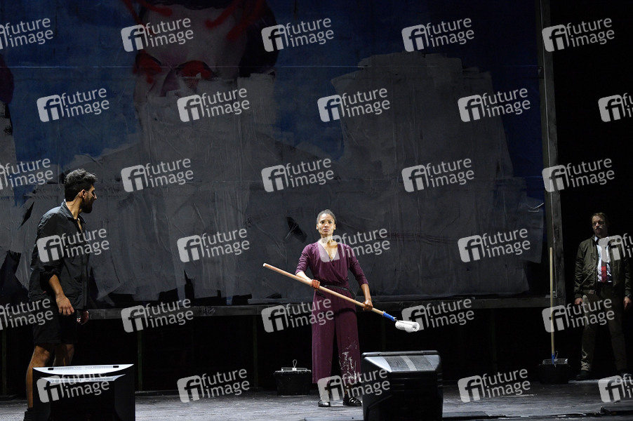 Armin Wahedi, Cynthia Micas und Oliver Kraushaar bei der Fotoprobe des Theaterstücks 'Gott ist nicht schüchtern' im Berliner Ensemble. Berlin, 28.08.2020