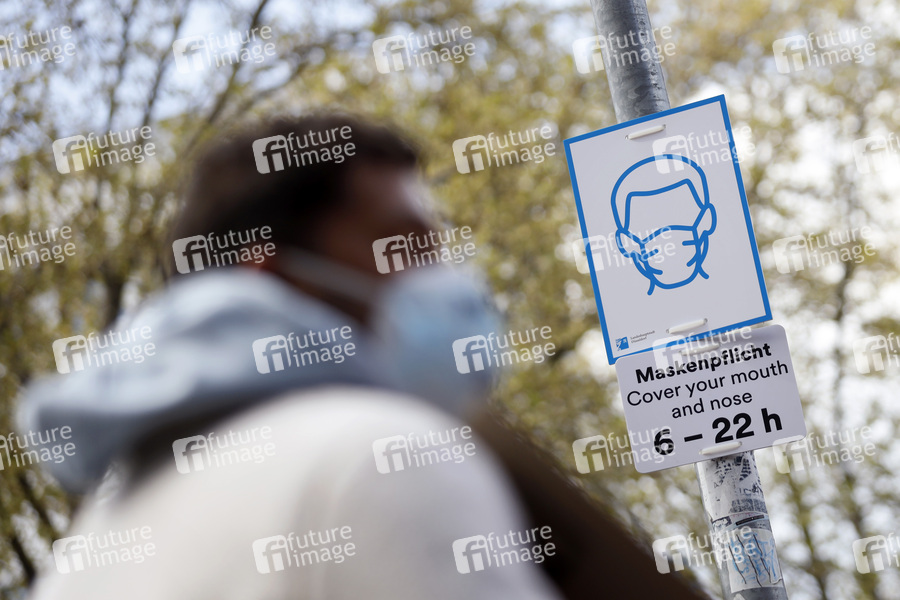 Ein Schild weist Teilnehmer einer Demo auf die Maskenpflicht vor dem Düsseldorfer Hauptbahnhof in der Zeit von 6 bis 22 Uhr hin. (Themenbild, Symbolbild) Düsseldorf, 01.05.2021