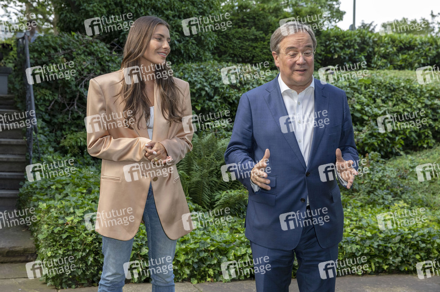 Sophia Thomalla und Armin Laschet beim Fototermin zum Online-Talk auf Facebook vor der Landesgeschäftsstelle der CDU Nordrhein-Westfalen. Düsseldorf, 25.06.2021