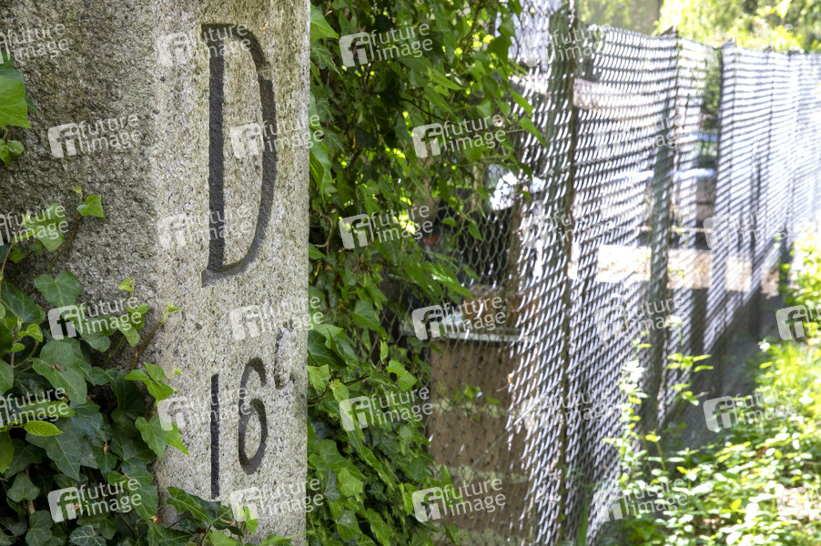 Wegen der Ausbreitung des Corona-Virus haben die Schweiz und Deutschland ihre Grenzen geschlossen. Alter Hintergarten-Grenzzaun mit Grenzstein D16C. Konstanz, 09.05.2020