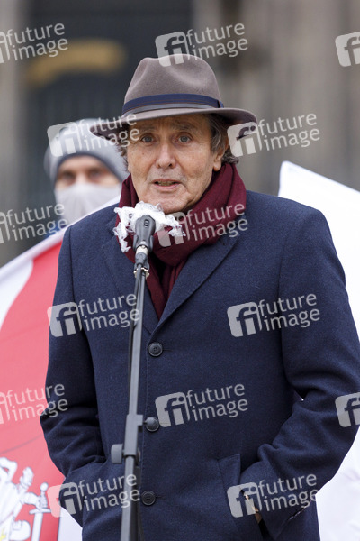 Hermann Krause spricht vor Demonstranten der 'Kundgebung für Demokratie in Belarus', die wegen Corona mit Mundschutz auf dem Roncalliplatz gegen Lukaschenko und das Vorgehen der Regierung in Weißrussland gegen die Opposition protestieren. Köln, 22.11.2020