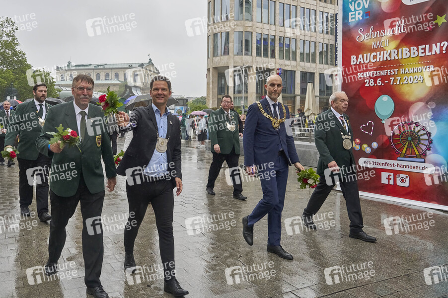 Paul-Eric Stolle (Präsident des Verbandes hannoverscher Schützenvereine), Belit Onay (Oberbürgermeister Hannover), Steffen Krach (Regionspräsident Region Hannover) und Uwe Weimann (Präsident Niedersächsischer Sportschützenverband e.V.) beim Schützenausmarsch zum 495. Schützenfest in der Innenstadt. Hannover, 30.06.2024