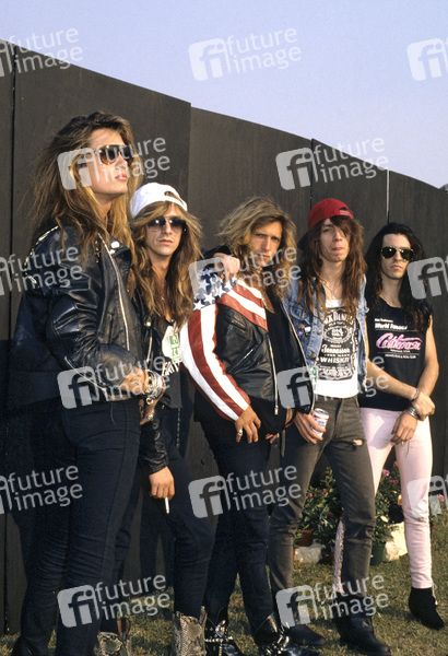 Sebastian Bach, Dave Sabo, Rob Affuso, Scotti Hill und Rachel Bolan von Skid Row bei einem Photoshooting im Milton Keynes Bowl. Milton Keynes, 18.08.1989