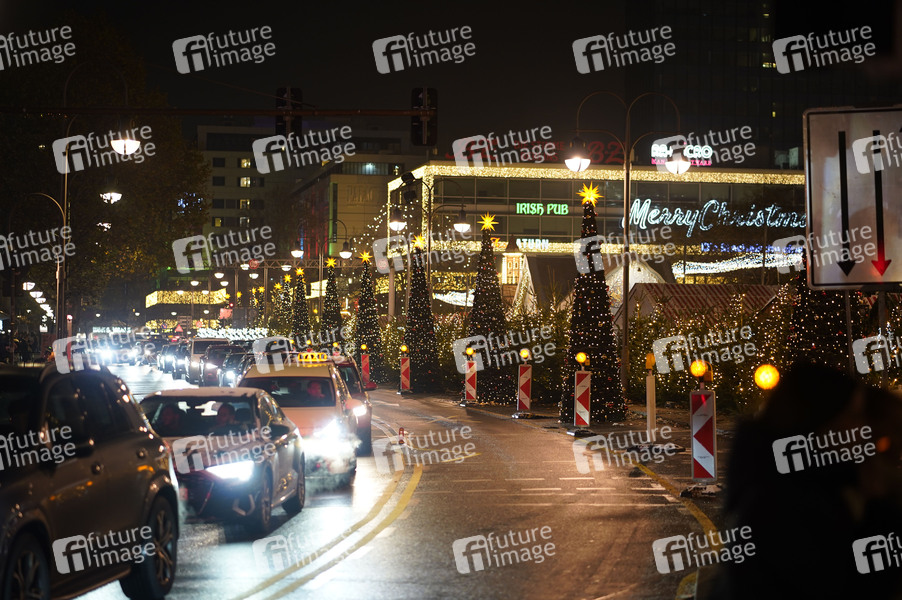 Geschmückte und bleuchtete Weihnachstbäume und Autos entlang der Budapester Straße