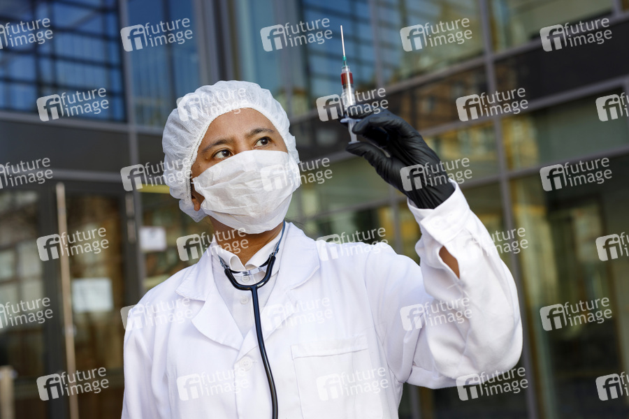 Eine Virologin posiert mit einer Spritze zur Impfung gegen das Corona-Virus. (Symbolfoto mit Model) Nürnberg, 23.04.2020