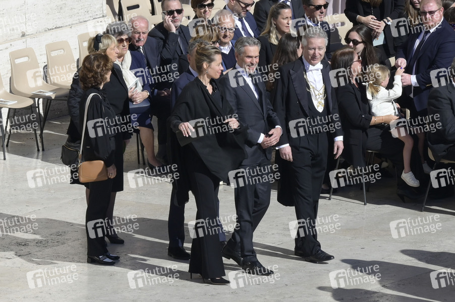 Dick Schoof mit Partnerin Loes Meurs bei der Trauermesse für den verstorbenen Papst Franziskus auf dem Petersplatz. Vatikanstadt, 26.04.2025