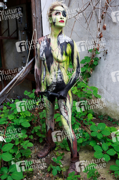Bodypainting, Erotik, Frau, Mädchen, nackt, draußen, weiblich, Körperkunst, Kunst, Malerei, Augenklappe, Peitsche, erotic, woman, girl, nude, outdoor, female, body art, body painting, eyepatch, whip