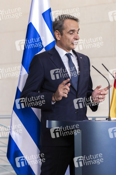 Kyriakos Mitsotakis beim Empfang des Ministerpräsidenten von Griechenland mit militärischen Ehren und zu einem gemeinsamen Gespräch mit dem Bundeskanzler mit anschließendem Pressestatement im Bundeskanzleramt. Berlin, 13.05.2025