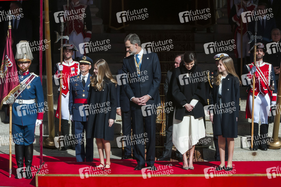 Prinzessin Sofia von Spanien, König Felipe VI. von Spanien, Königin Letizia von Spanien und Prinzessin Leonor von Spanien bei der feierlichen Eröffnung der XIV. Legislatur des Congreso de los Diputados, des Unterhauses des spanischen Parlamentes, vor dem Palacio de las Cortes. Madrid, 03.02.2020