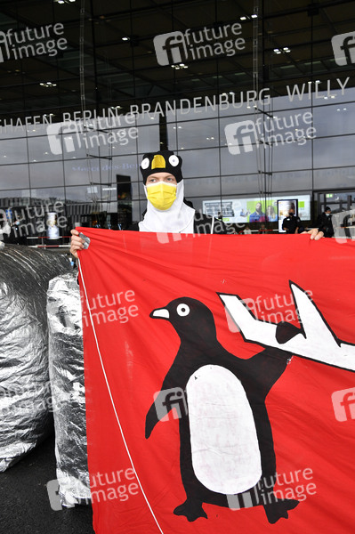 Klimaaktivisten der Aktionsgruppe 'Am Boden bleiben' protestieren gegen die Eröffnung des Flughafens Berlin-Brandenburg (BER). Schönefeld, 31.10.2020
