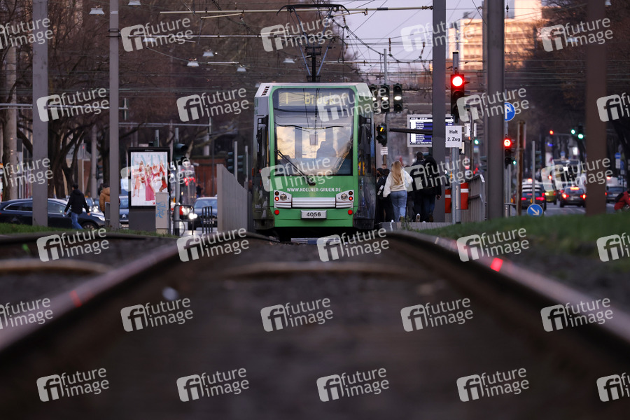 Eine KVB-Bahn der Linie 1 (in Richtung Brück) auf der Aachener Straße in Richtung Neumarkt. An Gleisen und in Bahnen herrschen wegen der Coronakrise Maskenpflicht und 3G-Regel. Wer nicht geimpft, genesen oder getestet in Bus und Bahn unterwegs ist, muss auch in Nordrhein-Westfalen ab sofort mit einem Bußgeld rechnen. (Themenbild, Symbolbild) Köln, 15.03.2021